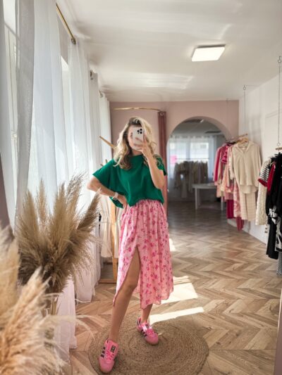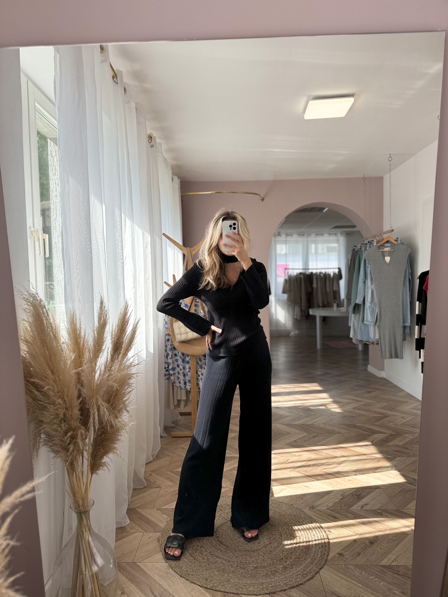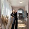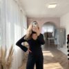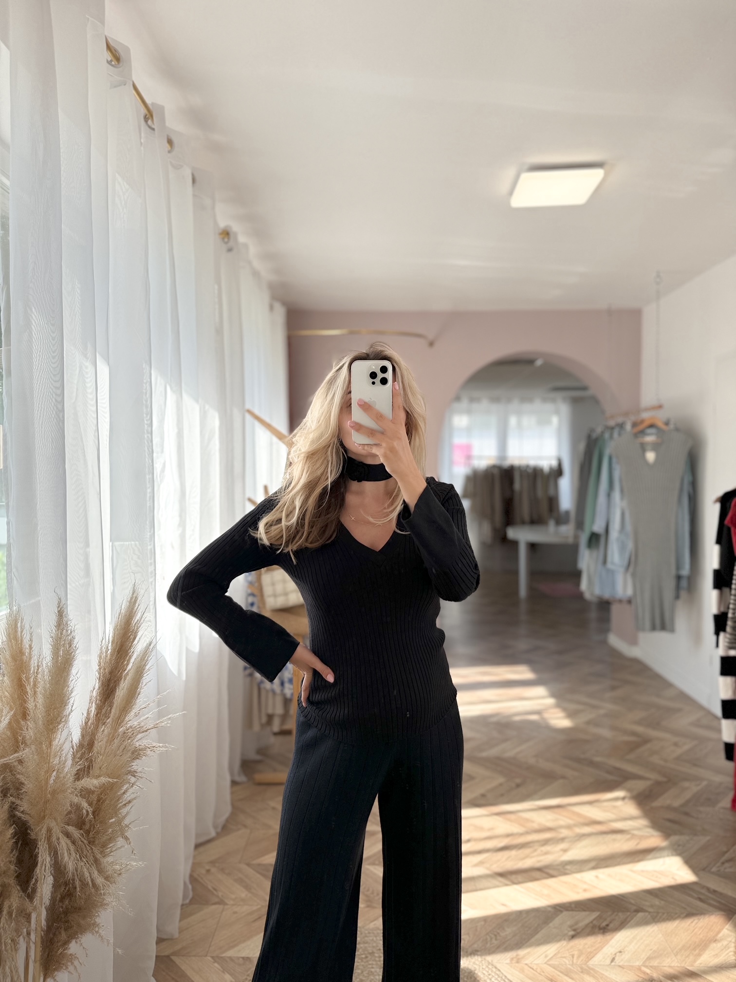 Bluzka prążkowana z dekoltem V. Posiada delikatnie rozszerzane rękawy. W komplecie jest choker, który może posłużyć jako ozdobna na szyję lub talię. Rozmiar uniwersalny.