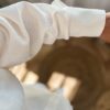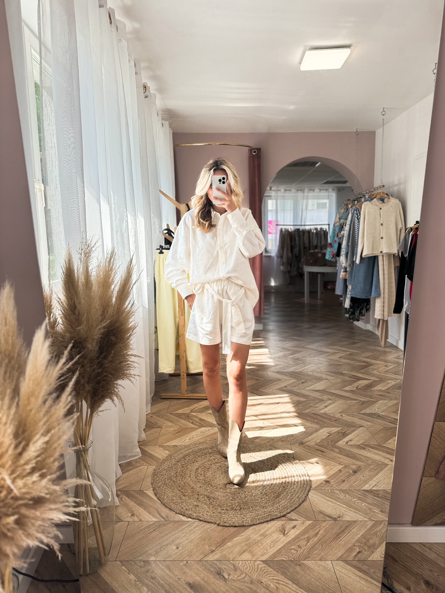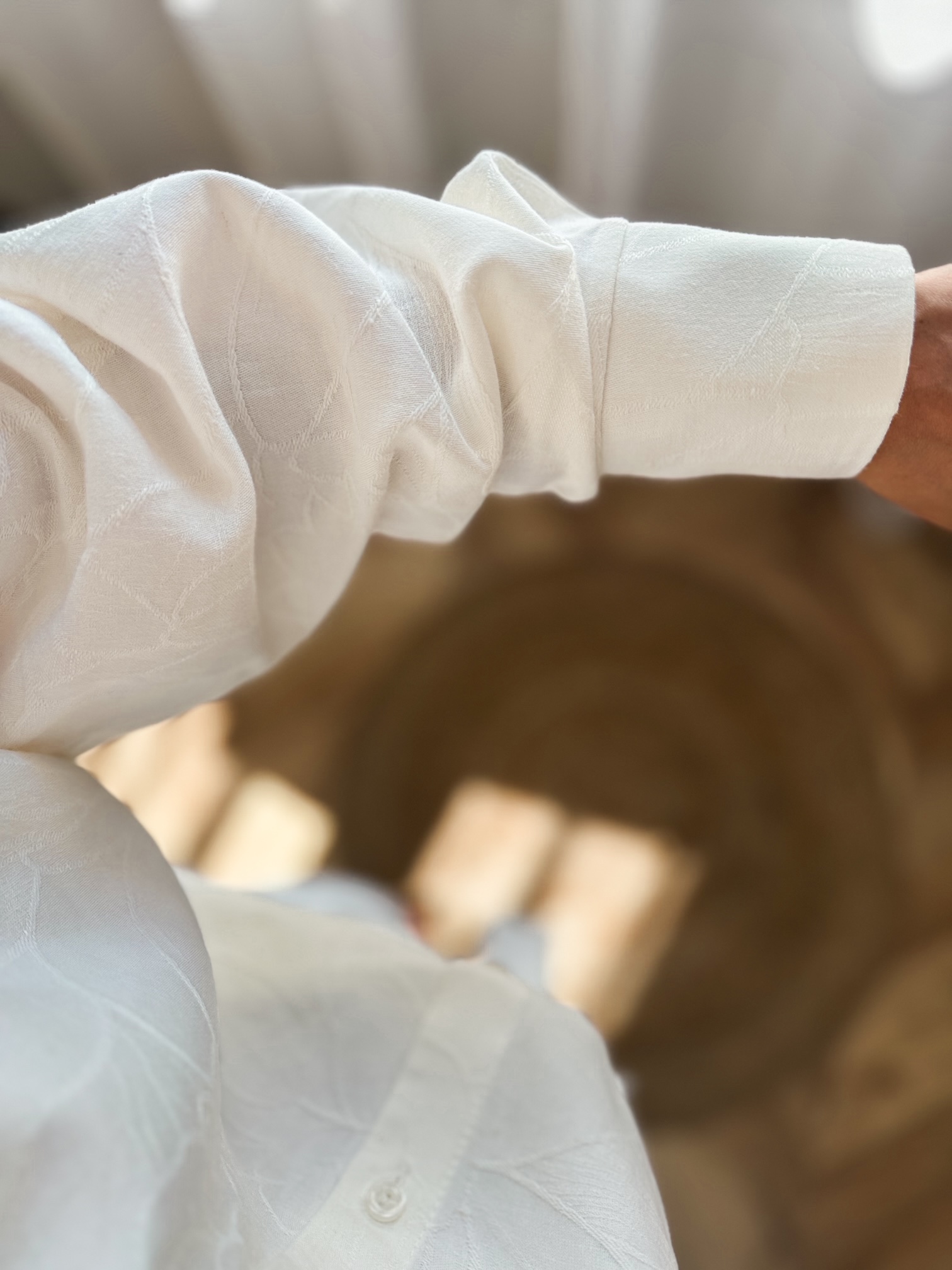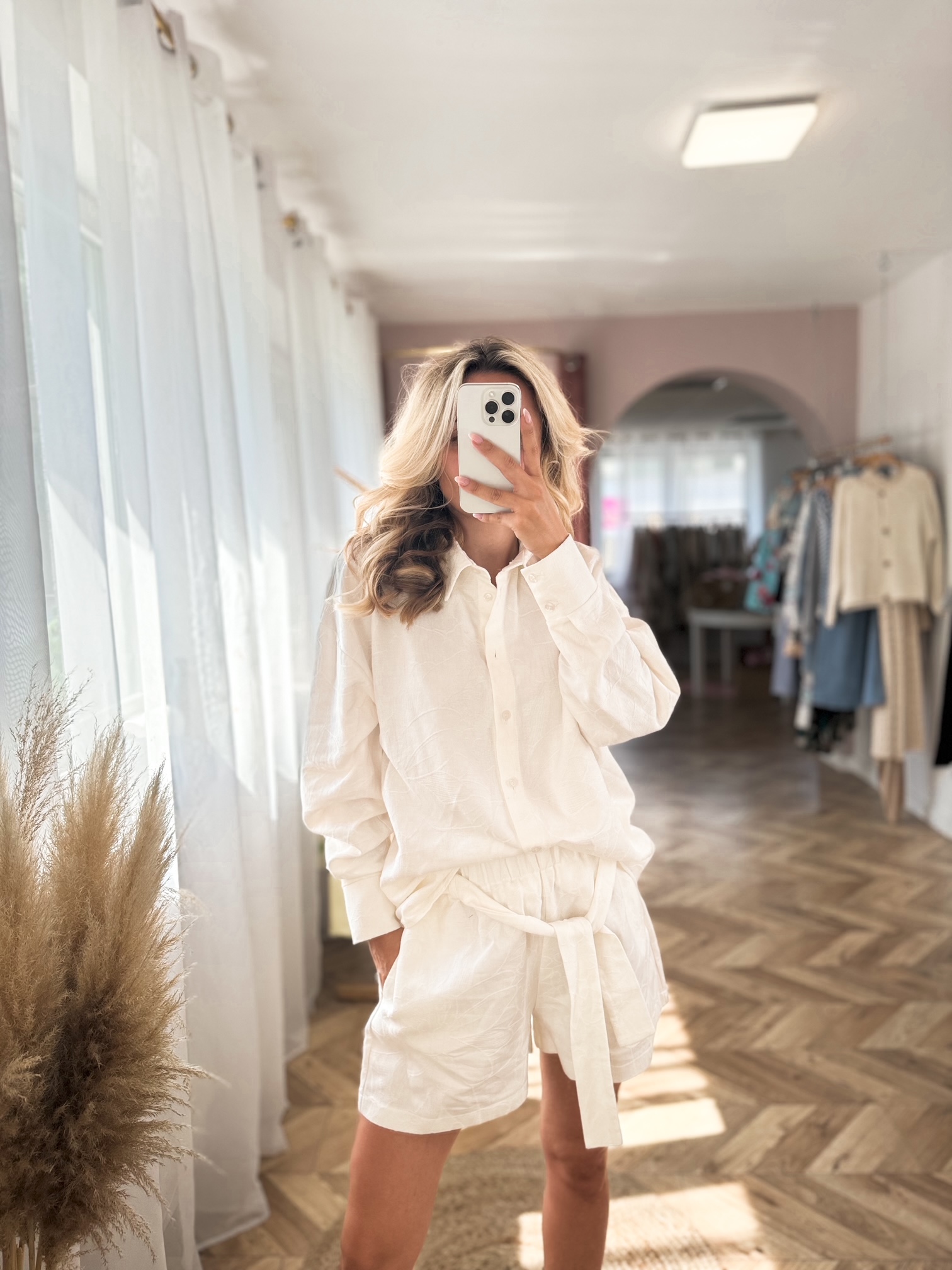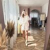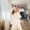 Komplet w kolorze śmietankowym z tłoczeniem. Składa się z oversizowej koszuli oraz szortów z wysokim stanem, które są na gumce. Występuje w rozmiarówce XS/S oraz S/M.
