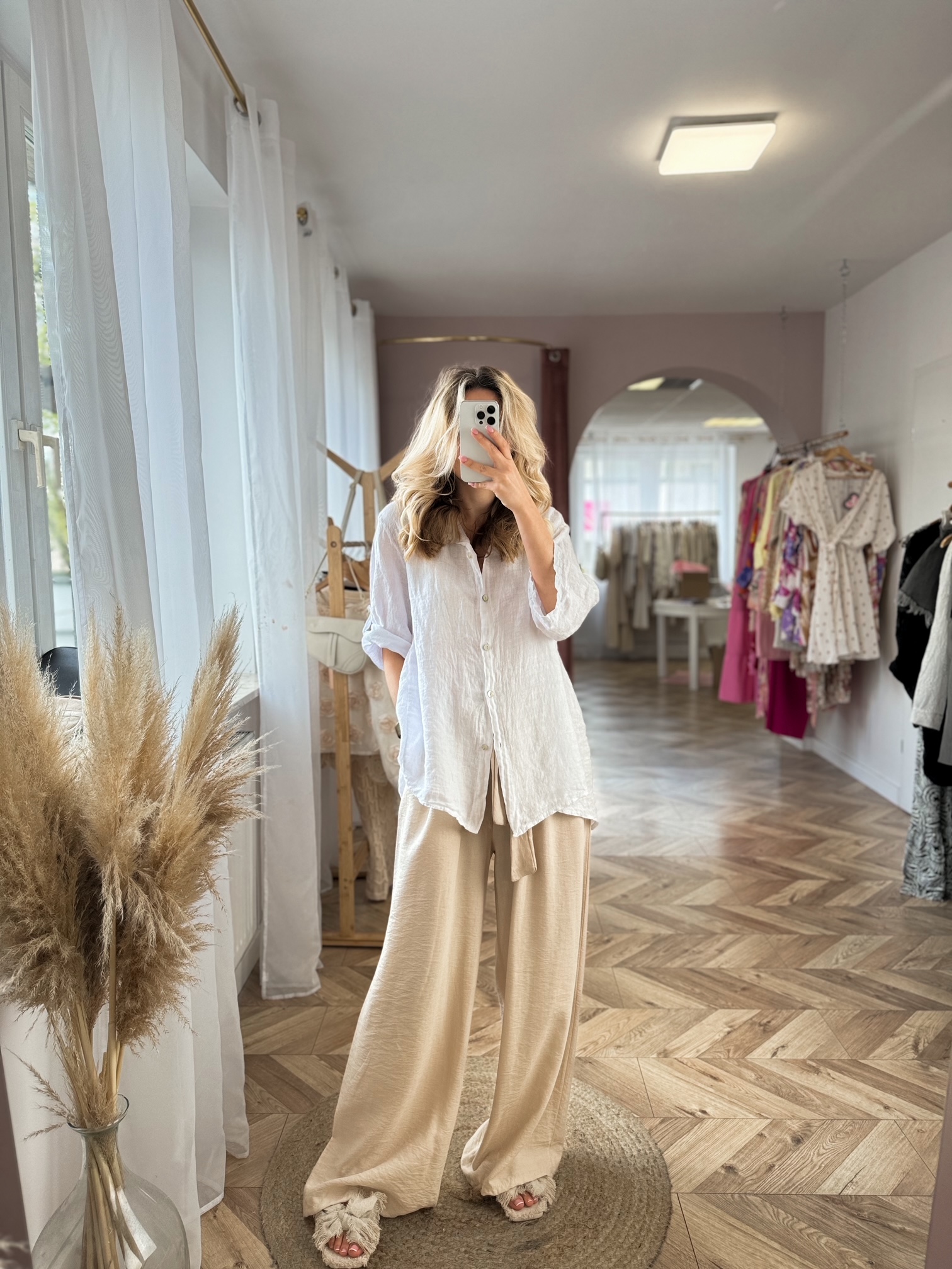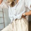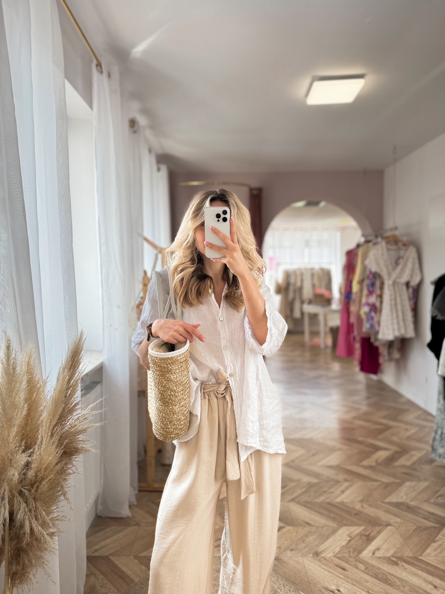 Klasyczna biała koszula z kołnierzykiem zapinana na guziki.