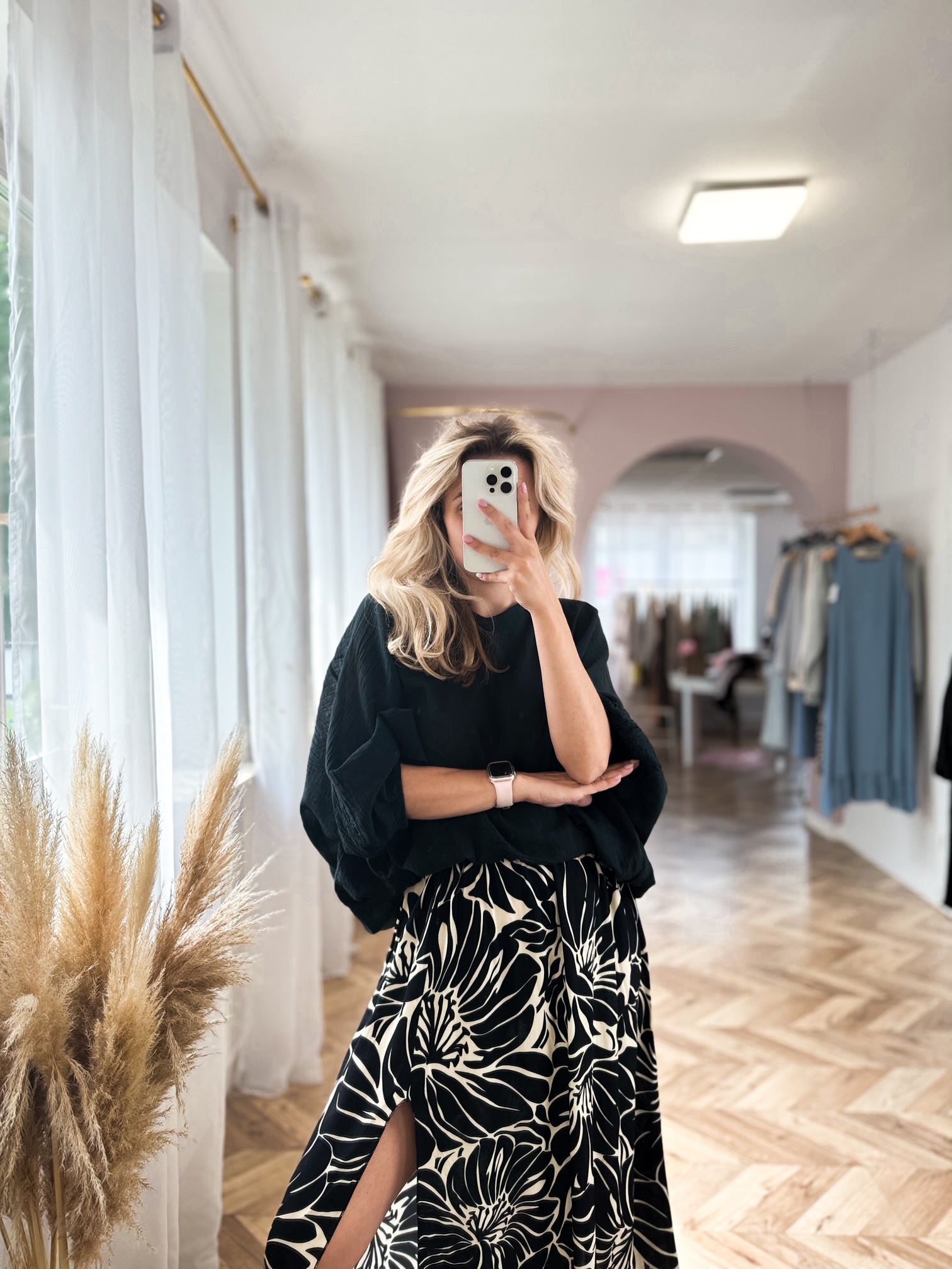 SPÓDNICA SABINA – BEŻOWO-CZARNE KWIATY