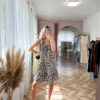 Muślinowa sukienka na wiązanych regulowanych ramiączkach, zakończona falbanką. Rozmiar uniwersalny – dobra do rozmiaru XS do XL.