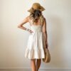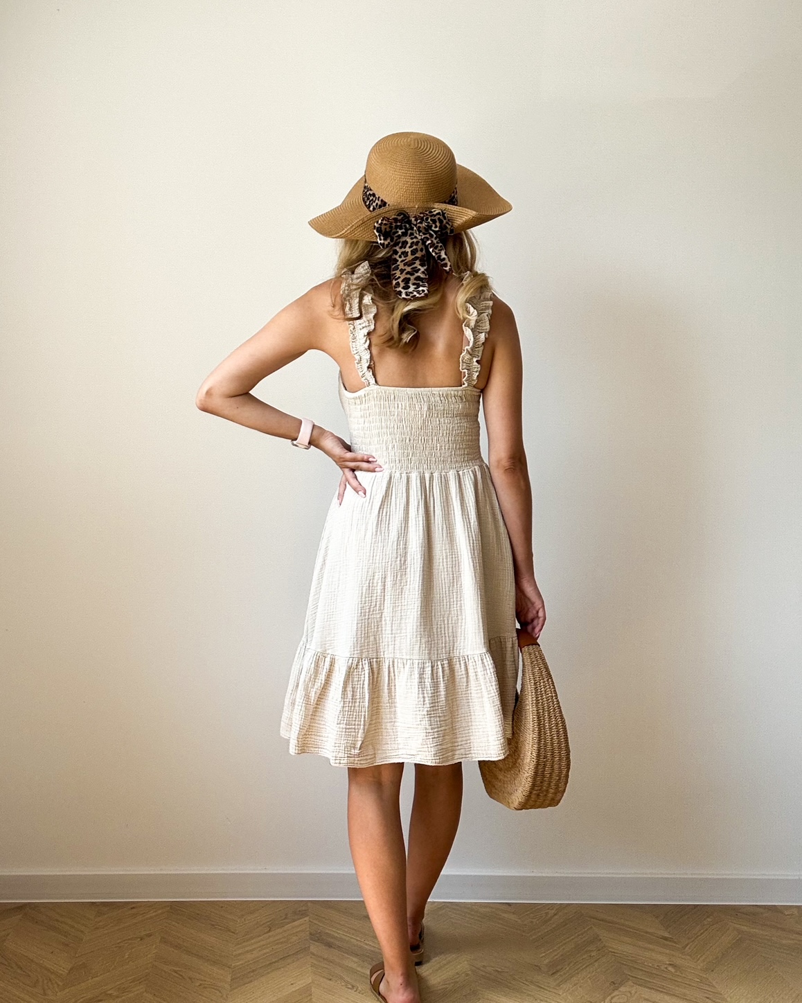 Muślinowa sukienka na fantazyjnych ramiączkach z gumonicią na biuście. Rozmiar uniwersalny – dobry do M/L.
