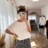 Laserowo cięty t-shirt z krótkim rękawem o oversizowym stroju. Rozmiar uniwersalny – dobry do XS do XL.